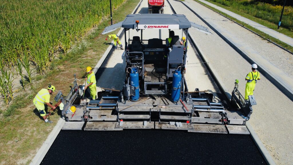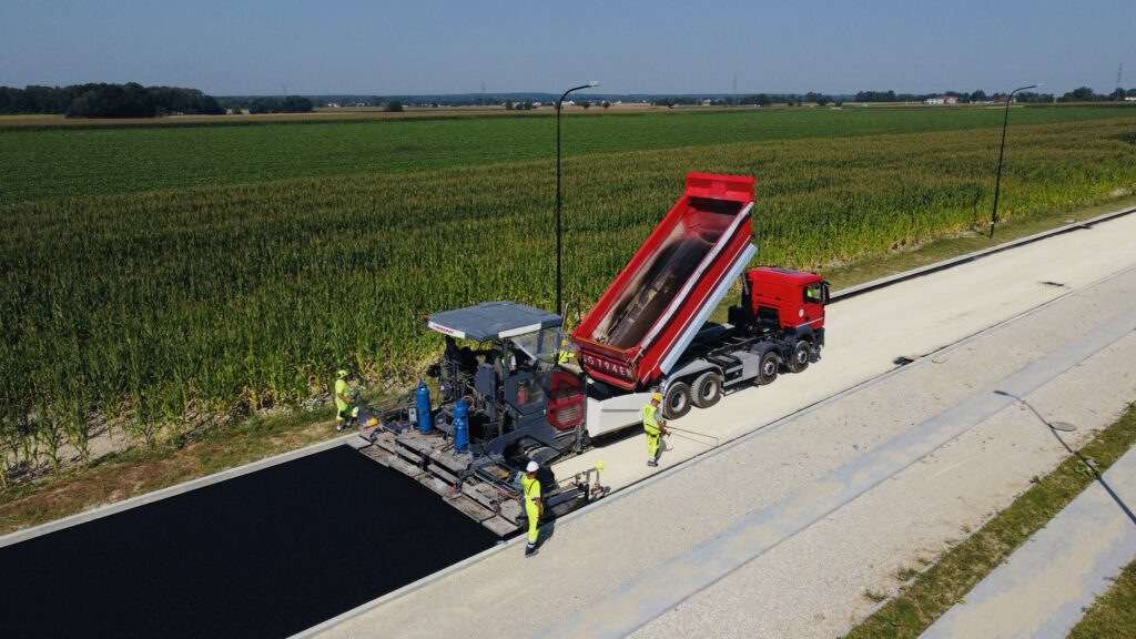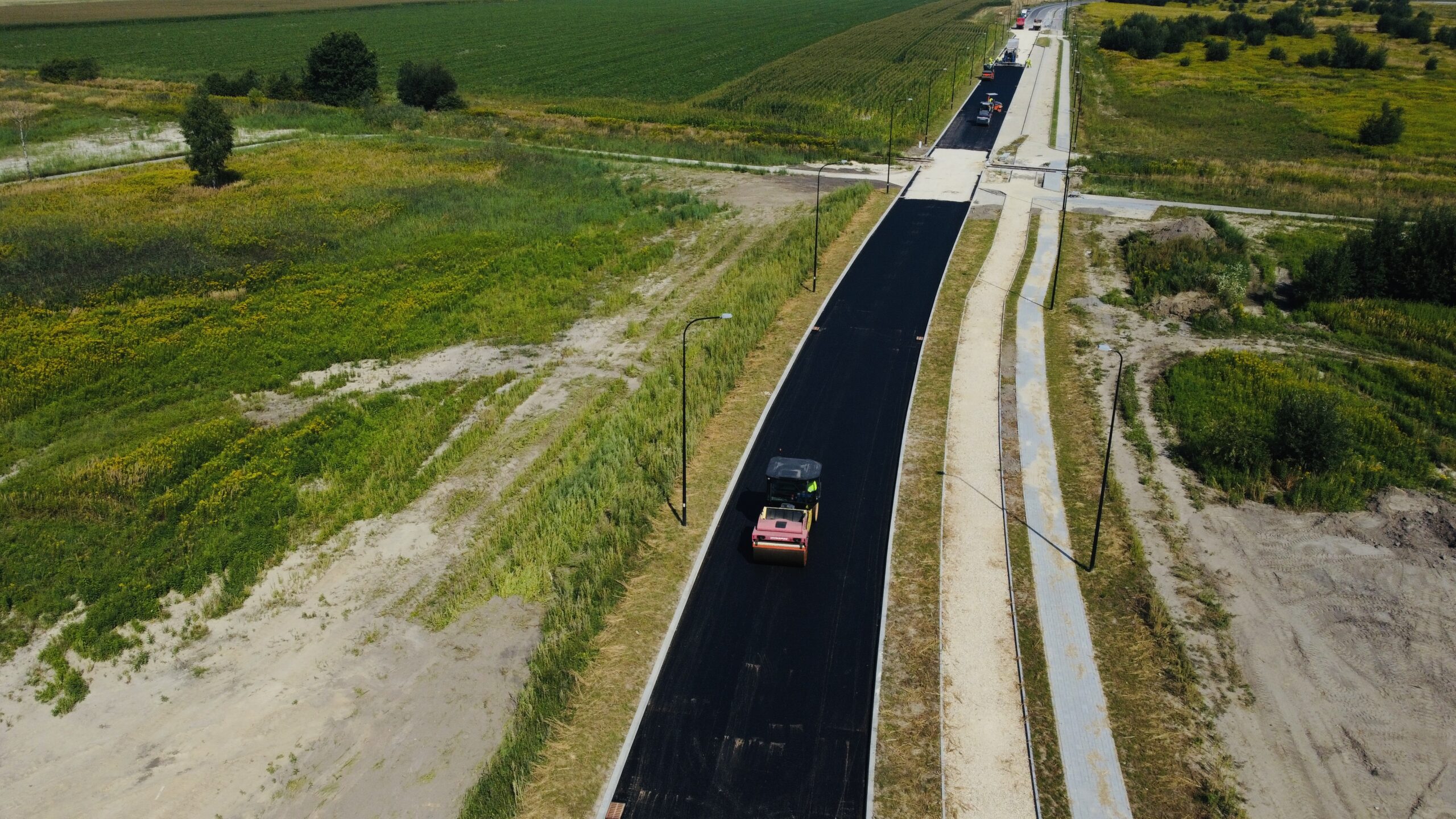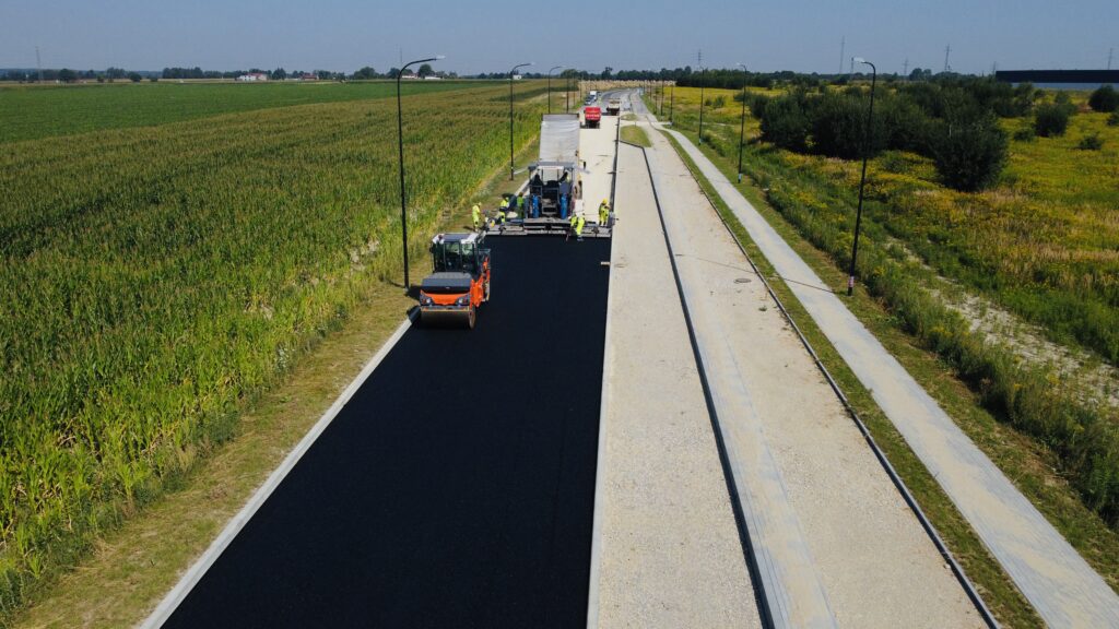 Ten ciemny pas na jezdni oznacza, że właśnie położyliśmy masę bitumiczną na kolejnym fragmencie 900 metrowego odcinka Szpitalna -Rybnicka w Knurowie. W następnej kolejności warstwa wiążąca pojawi się na ścieżce rowerowej i miejscach postojowych. To drugi etap realizacji obwodnicy Knurowa – połączy knurowską strefę ekonomiczną z ulicą Rakoniewskiego.