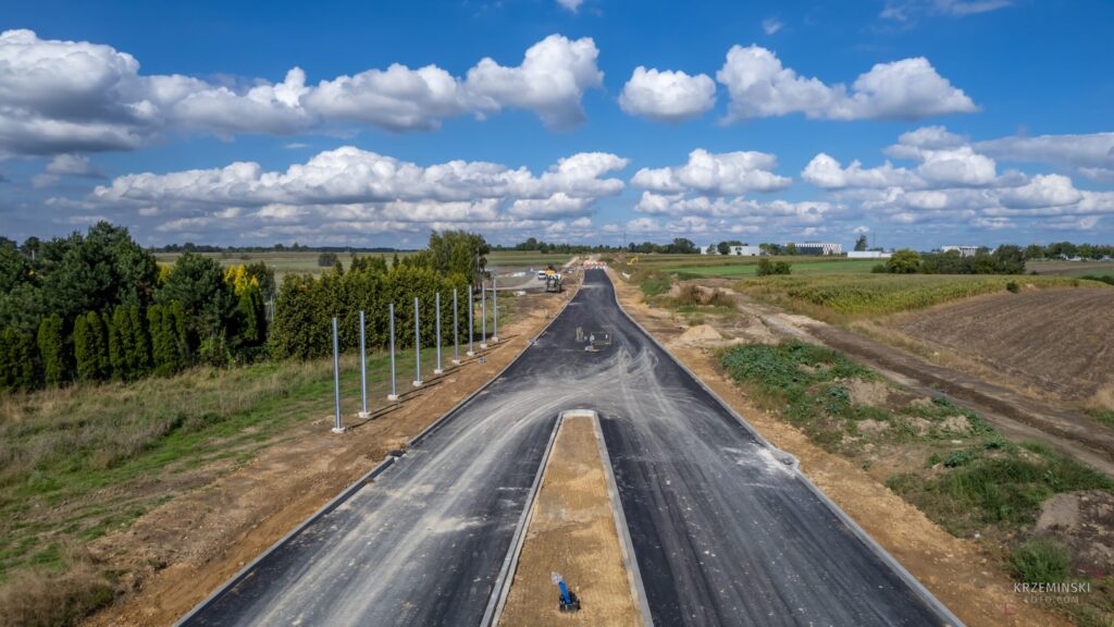 W dalszym rejonie placu robót – patrząc w kierunku ul. Daszyńskiego – gotowe są już dwa obiekty mostowe nad istniejącym rowem melioracyjnym. Pierwszy będzie służył do przejazdu maszyn rolniczych i jako przejście dla zwierząt (pod drugim poprowadzony zostanie ciek wodny). Widoczne są również odcinki trasy głównej pokryte asfaltem.